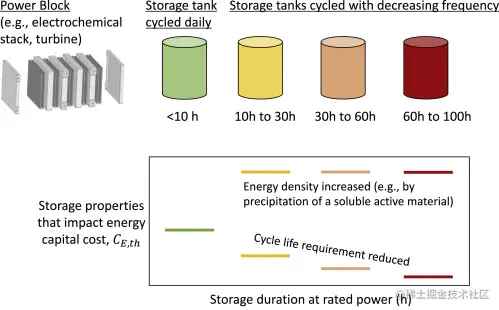 一个完全不同的系统架构的概念示意图,其中与LDES应用相关的不同循环频率可以被利用来创建一系列具有优化属性的储能罐,以降低资本成本,而不是在所有持续时间内使用一个统一的储能罐。 例如,可以在现有的涡轮机上添加一个储热单元,使用电阻加热或其他方法将热量添加到储热库中,并且现有涡轮机由其预期的[热能]来源(例如,天然气)、来自储热库的热能或两者的组合提供动力。在这种方法中,电力成本可能仅包括将热库与现有涡轮机连接所需的额外防喷器以及电阻加热器(用于充电),从而在满足LDES总体成本目标的同时为能源成本提供了更大的空间。这些方法只是设计[储能系统]的根本不同方法类型的两个例子,这些方法特别适合LDES应用的新技术经济设计空间。