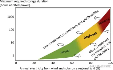 在这些研究的背景下,[图1]提供了满足需求所需的最大存储持续时间与风能和太阳能年度能源比例之间的高层次和半定量关系。[图1]中的彩色区域表示与可再生能源削减、输电扩建和电网灵活性(即必须运行的发电机数量、需求响应)相关的典型假设,而箭头表示更具限制性(向左)或更激进(向右)的假设。该图显示,在风能和/或太阳能装置的容量系数为20%至50%的情况下,在达到更高比例之前可能只需要很少的存储,特别是在风能和太阳能混合优化的地区。[8],[9]根据该地区的特性(例如,太阳能和/或风能资源的质量,传输系统的能力,天然气量与低[斜坡率]资源),大约50%到80%的太阳能和/或风能的年能量可以达到,存储时间≤10小时。[11]然而,可能需要更长的存储时间来实现大约70%到90%的风能或太阳能的年能量,存储时间为10到数百小时。[10],[14]鉴于需要完全可靠的电力供应,如果风能和太阳能的年能量比例接近100%,则存储持续时间可能进入季节性甚至跨年领域。[10]实现仅由风能和太阳能等可变来源供电的电网通常被认为比使用一套发电技术更不经济,风险更高,其中一些发电技术完全可调度和/或提供[基荷]。