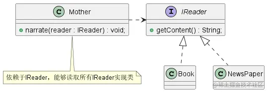 想要降低 Mother 和 Book 之间的耦合度,我们可以抽象出一个接口 IReader ,用于表示带文字的读物。 Mother 依赖于 IReader ,Book 和 NewsPaper 都属于读物的范畴,因此他们都需要各自实现 IReader 接口,这样妈妈就能够读取任何带文字的事物,符合现实世界业务逻辑。