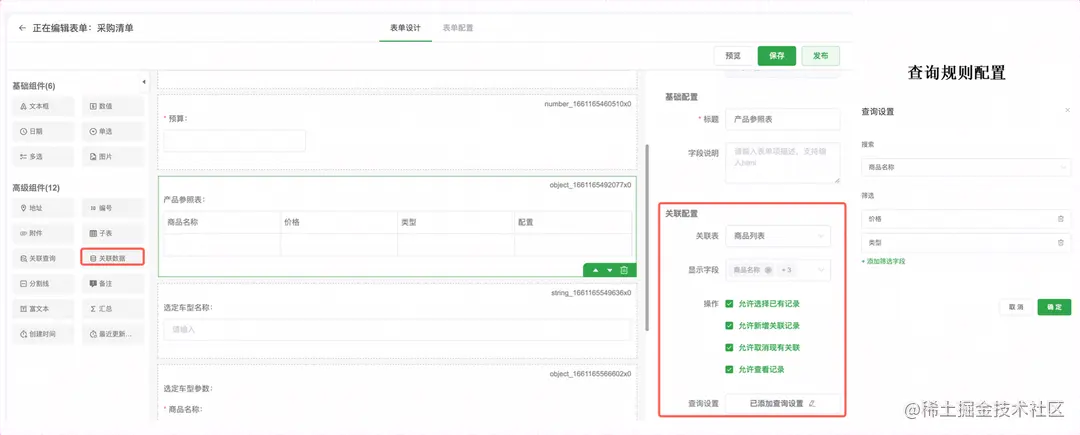 通过关联数据组件,可以配置并关联外部表单信息,指定查询规则,通过表单之间的数据联动,完成比较复杂的业务功能,数据存储在外部表单中。