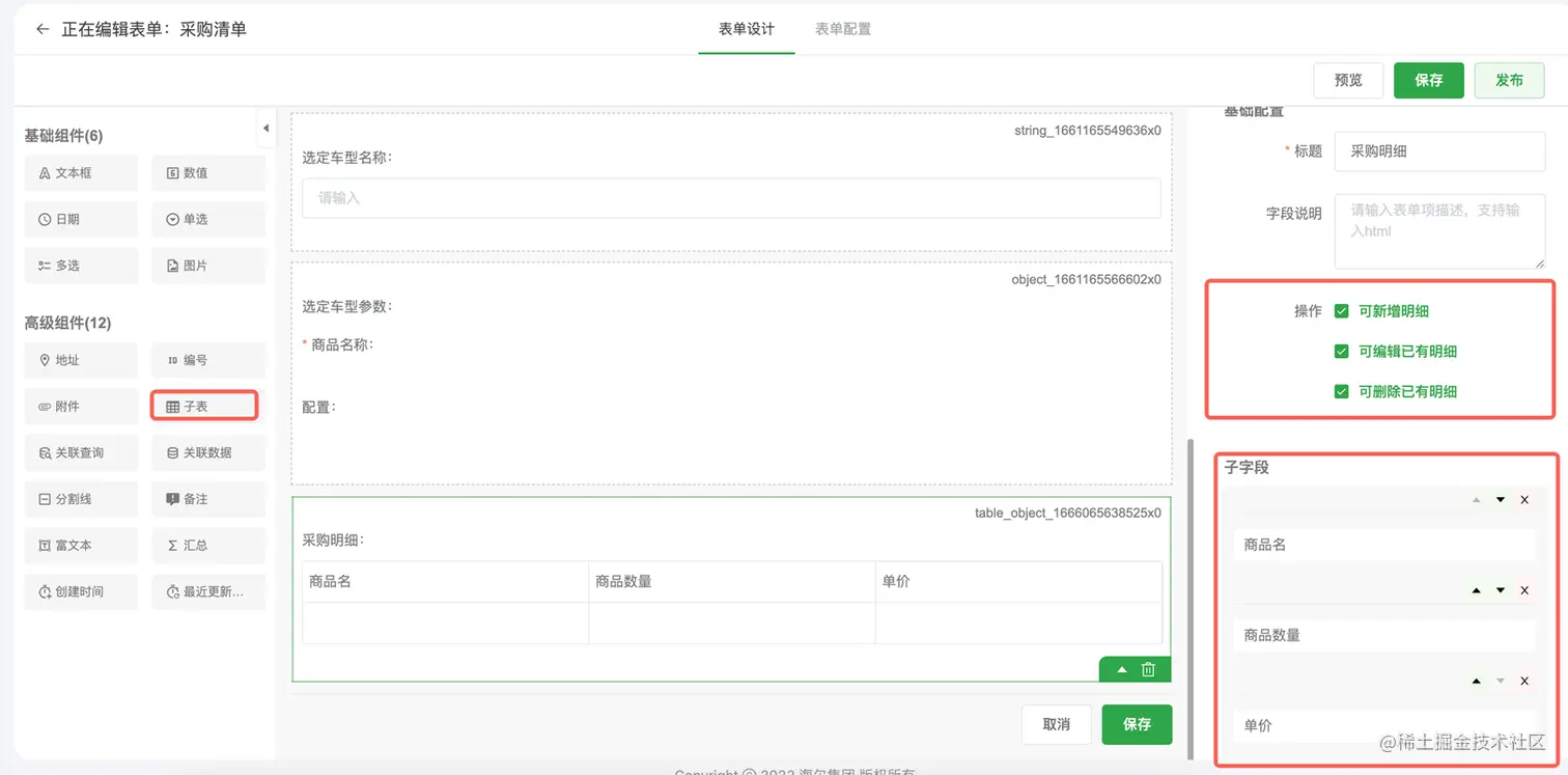 实际业务中表单之间存在关联关系,主子表是最常见的关系类型之一,使用子表组件可以方便的配置子表信息,并自动生成相关操作类型,满足基础关联型业务模型的使用。