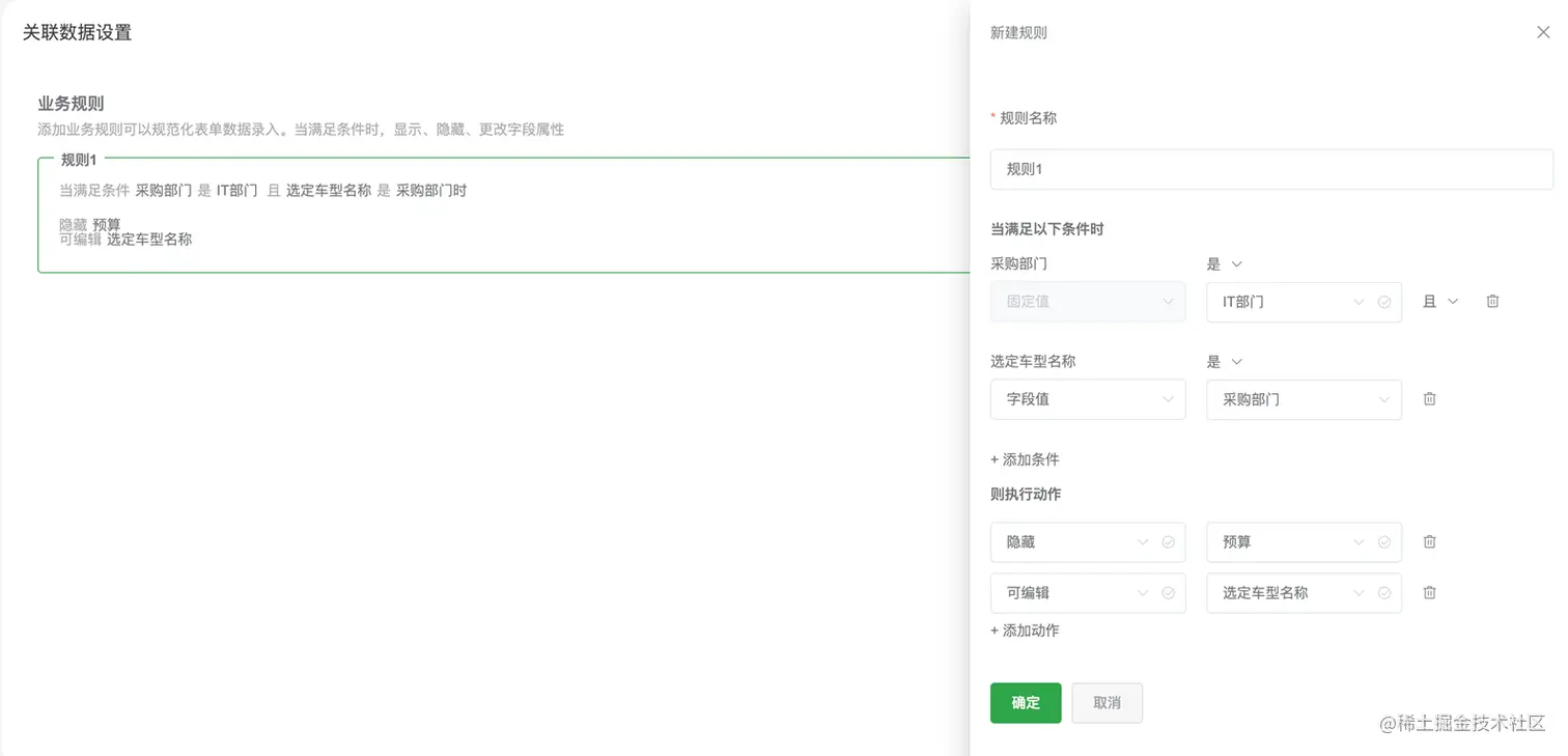 支持根据表单字段规则(支持匹配固定值或表单字段),设置目标字段的可选动作(当前提供显示、隐藏、编辑、只读、必填操作)。