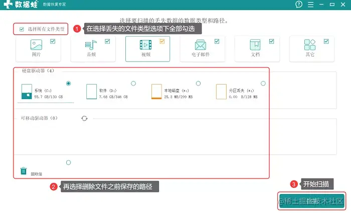 第3步: 选择要扫描的磁盘,就是文件丢失的位置。接着选择要扫描的文件类型,点击【开始扫描】。