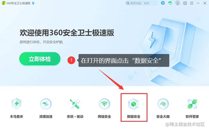 第1步: 打开360安全卫士的界面,选择【数据安全】;