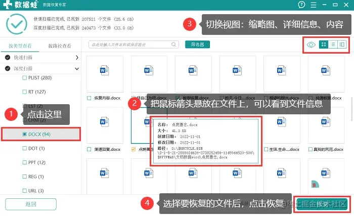 第2步: 第一次扫描没有找到要恢复的数据,请进行第二次【深度扫描】。扫描结束,点击要恢复的文件类型,想要查看文件信息,可以把鼠标箭头放在某一文件上方。想要更换不同的视图来查看文件,可以分别点击界面右上角的【切换视图】。把要恢复的文件都选择上,点击【恢复】,保存好存储位置即可。