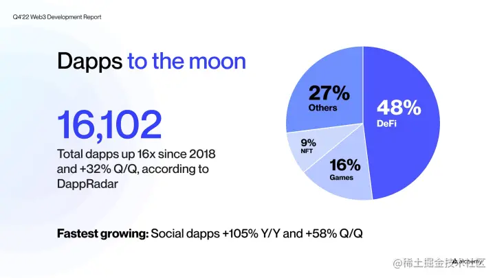 截至 2022 年 12 月,DappRadar 已在所有链上注册了 16,102 个 dapp,自 2018 年以来增长了 16 倍,与 2022 年第三季度相比增长了 32%。