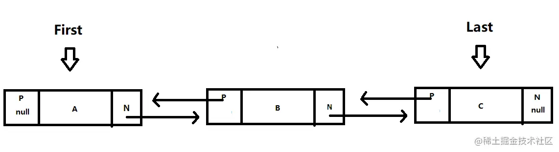 - last 指向 newNode(C),由于 l != null 并且指向 node(B),所以 node(B).next 指向 newNode(C)