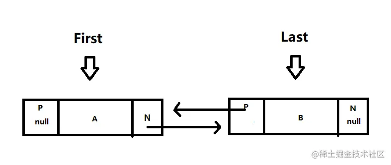 - last 指向 newNode(B),由于 l != null 并且指向 node(A),所以 node(A).next 指向 newNode(B)