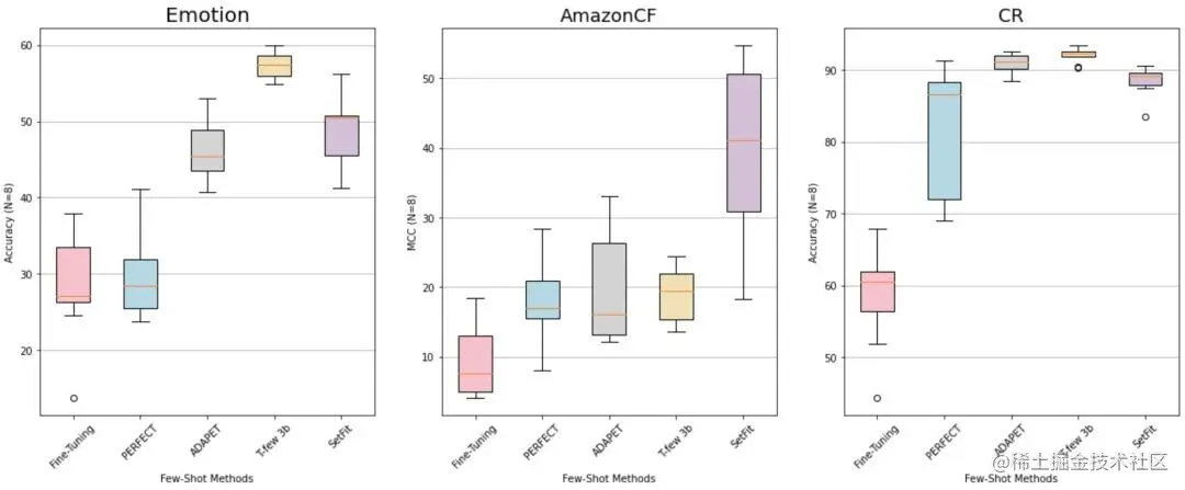 在其他的数据集上,SeiFit 在各种各样的任务中也展示出了鲁棒的性能。如下图所示,每类仅需 8 个样本,其典型性能就超越了 PERFECT、ADAPET 以及微调后的原始 transformer 模型。SetFit 还取得了与 T-Few 3B 相当的结果,尽管它无需提示且模型小了 27 倍。