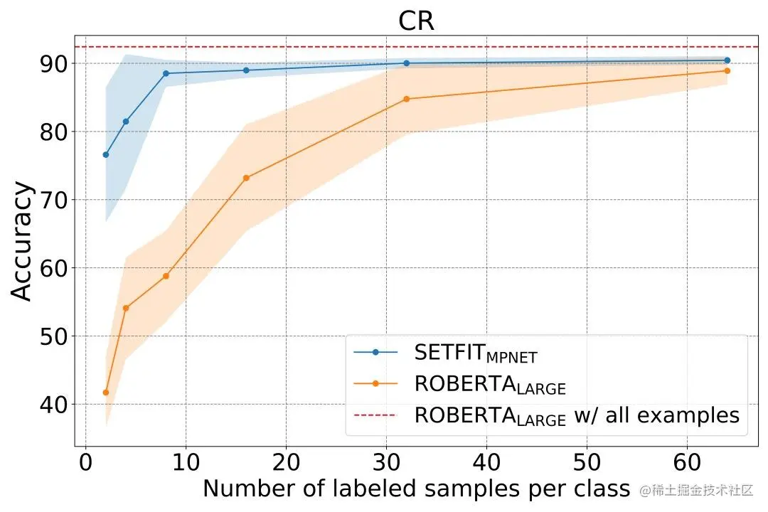 因此,我们非常高兴地向大家介绍 SetFit: 一个基于 Sentence Transformers 的高效的少样本微调 (fine-tune) 框架,该工作由 HuggingFace 和我们的研究伙伴 Intel Labs 以及 UKP Lab 合作完成。SetFit 仅需使用很少的标注数据就能达到较高的准确率。举个例子,在客户评论情感数据集 (Customer Reviews (CR) sentiment dataset) 上,每类仅使用 8 个标注样本,SetFit 的准确率就和在 3 千个标注样本的训练全集上微调 RoBERTa Large 相当了 🤯!