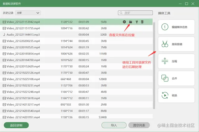**步骤5.**在接下来跳出的【录制历史】页面,您可以查看以往的历史文件,通过点击视频右侧的【文件夹】图标,您可以查看文件所在位置。使用【媒体工具】还可以对文件进行合并(可以导入本地视频文件)、压缩、转换等处理。