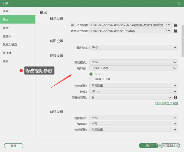 备注:如何修改视频的参数?点击【视频录制】页面右上角的【输出设置】,进入【设置】页面,在此页面,您可以对视频的参数(格式、编码器、帧率、输出质量等)进行修改。
