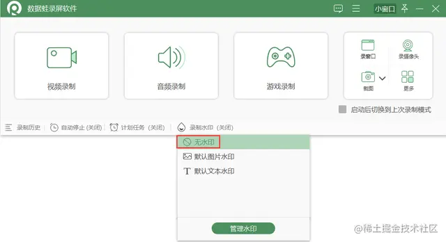 今天小编给大家带来的屏幕录制下载安装推荐是——数据蛙录屏软件。它支持多种录制模式,能满足生活中绝大部分录屏需求。在软件的主界面下方,您可以点击【录制水印】,选择无水印录制,还可以点击【管理水印】,设置自己的文字水印或者图片水印。