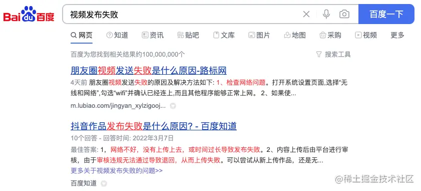 在百度搜索“视频发布失败”,跳出的相关结果有超过 1 亿条。
