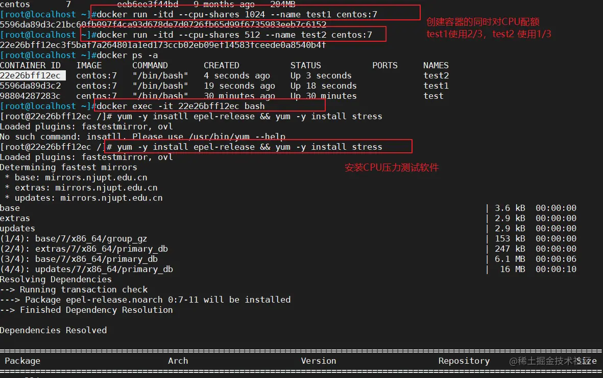 docker run -itd --name test1 --cpu-shares 1024 centos:7
