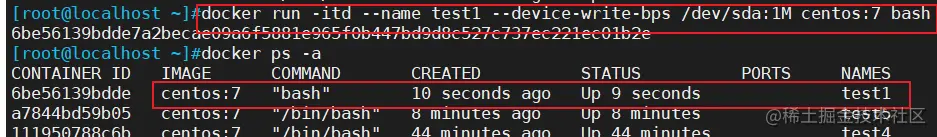 例:docker run -itd --name test1 --device-write-bps /dev/sda:1mb centos:7 /bin/bash