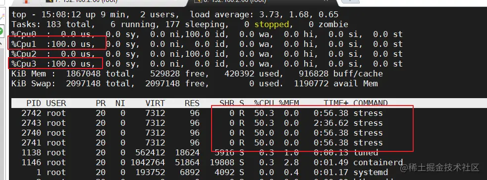 stress -c 4 #产生四个进程,每个进程都反复不停的计算随机数的平方根