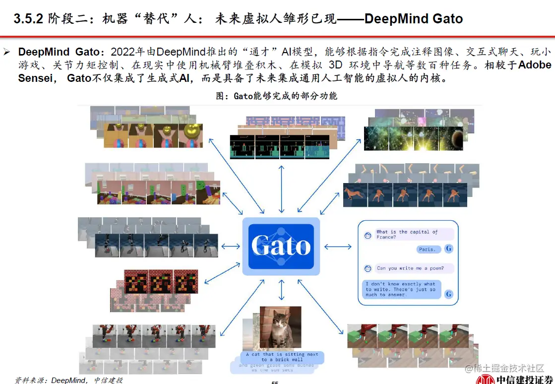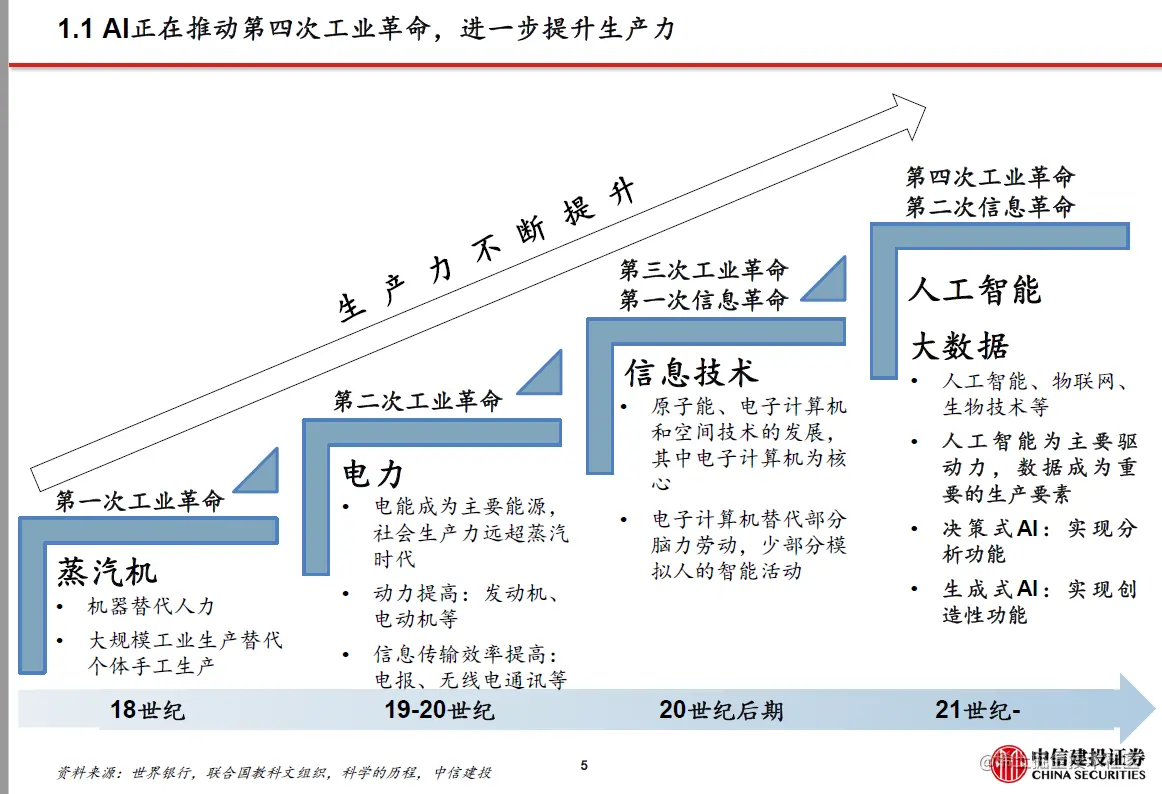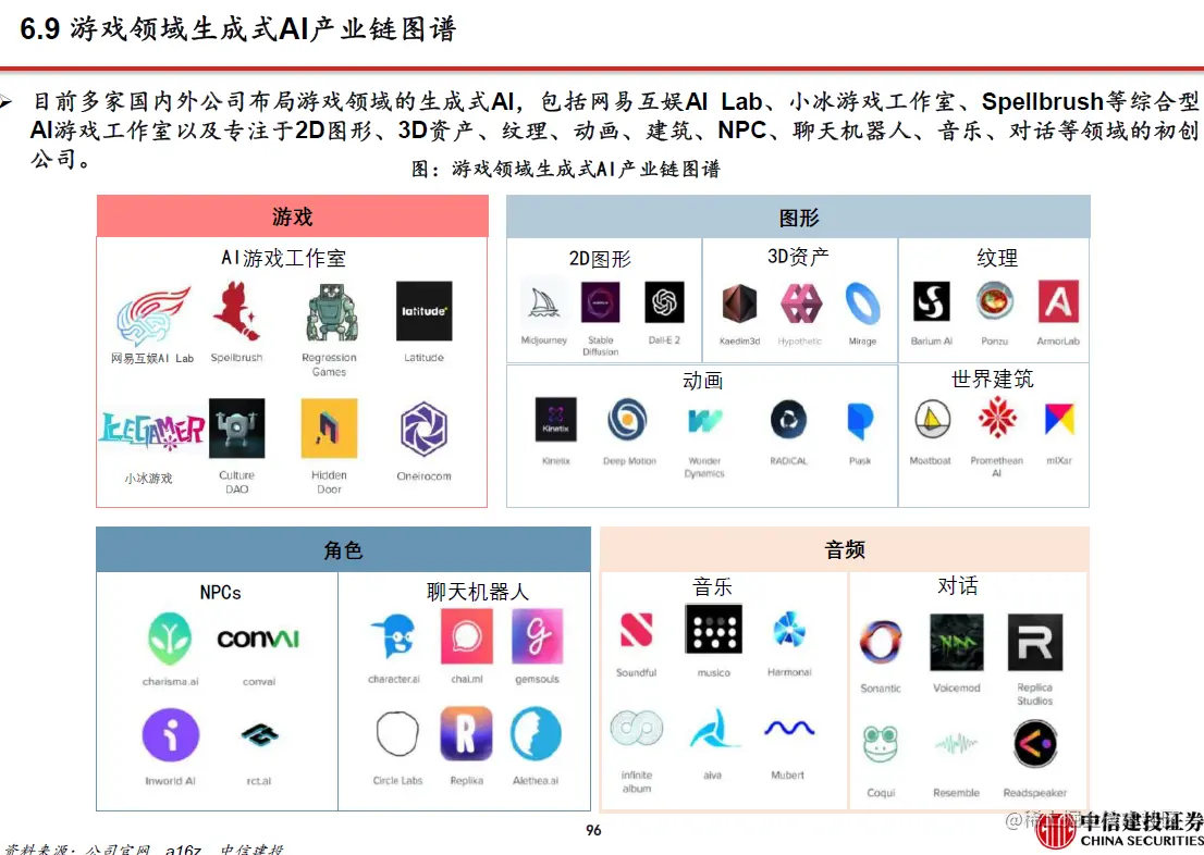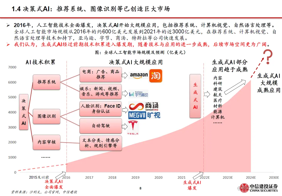 此前的决策式AI模型(Discriminant Model)是根据已有数据进行分析、判断、预测,典型应用为内容的智能推荐(短视频)、自动驾驶等;而生成式AI更强调学习归纳后进行演绎创造,生成全新的内容,本质是对生产力的大幅度提升和创造,已催生了营销、设计、建筑和内容领域的创造性工作,并开始在生命科学、医疗、制造、材料科学、媒体、娱乐、汽车、航空航天进行初步应用,为各个领域带来巨大的生产力提升。