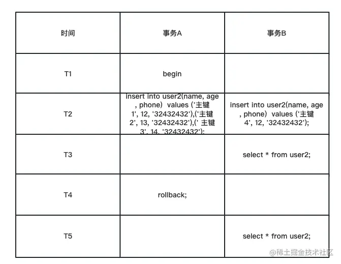 假设主键连续的情况下,t5时刻和t3 时刻的主键都应该是1,因为事务A 发生了回滚,假如没有发生回滚,那么事物B的ID应该是4.