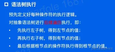 语法树执行 通过后序遍历二叉树的方式执行代码,后序便利的顺序为左子树->右子树->根结点