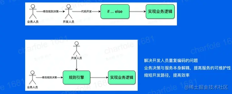 规则引擎的定义: 规则引擎是一种嵌入在应用程序中的组件,实现了将业务决策从应用程序代码中分离出来,并使用预定义的语义模块编写业务决策。接受数据输入、解释业务规则、并根据业务规则做出业务决策。
