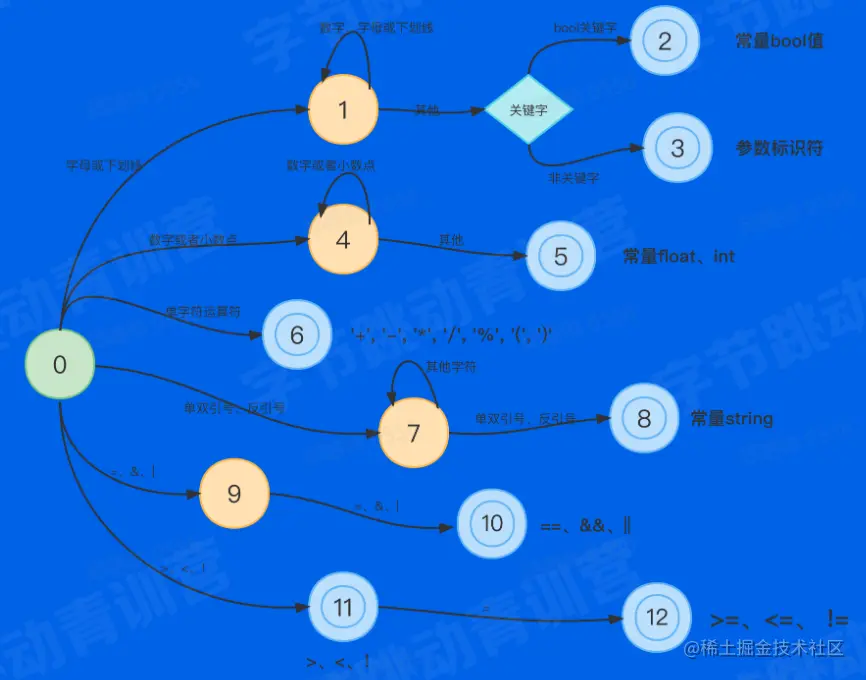 实现方式——有限自动机:状态机,状态数量有限,基于输入的字符做一个确定的状态转换 -