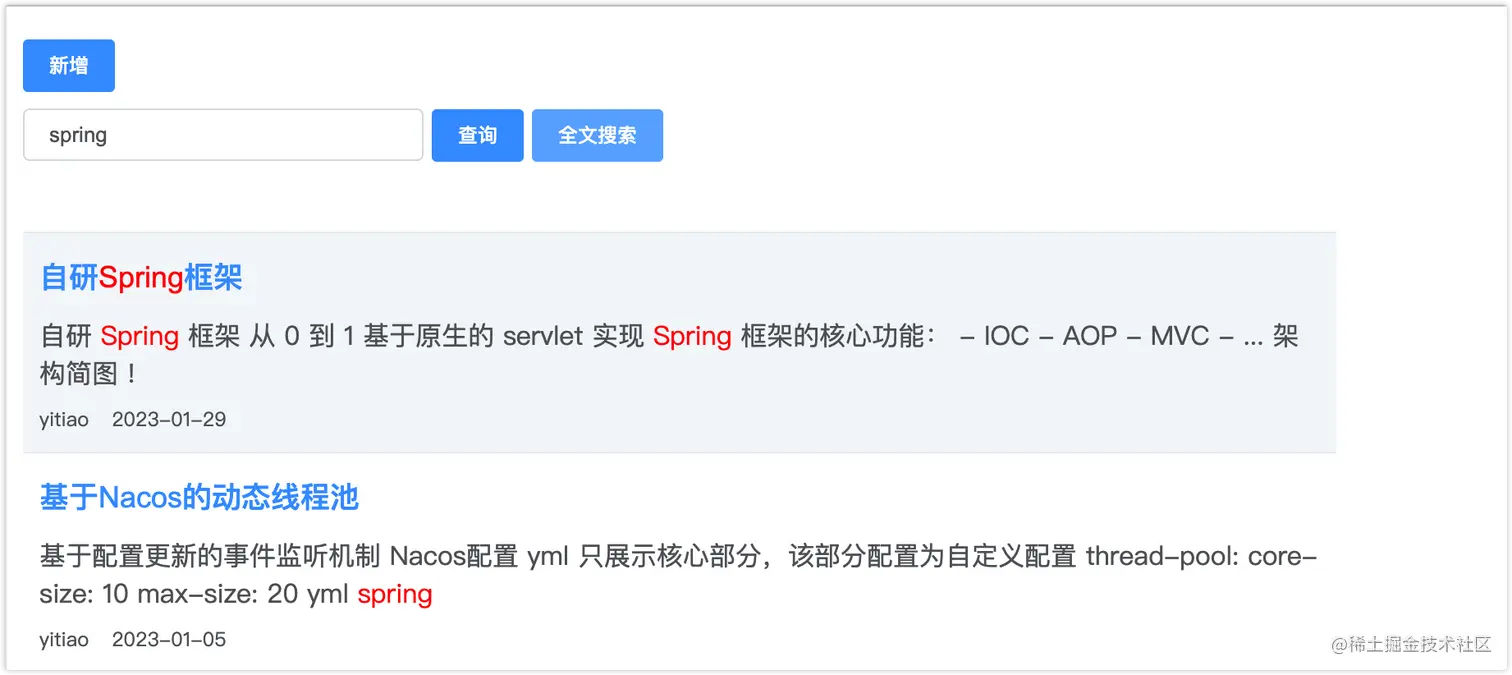 今天要聊的就是「博客管理」中全文搜索的实现,基于 SpringBoot+Vue+ES 实现,先给大家看一下效果: