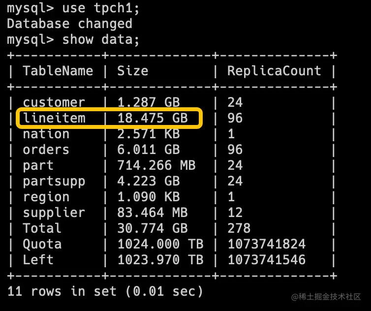 tpch1库(DecimalV3)的 Lineitem 表的存储占用为 18.475GB