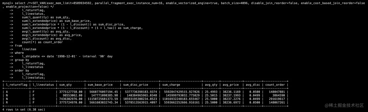 tpch1库(DecimalV3)的 SQL 执行结果为 6.38s