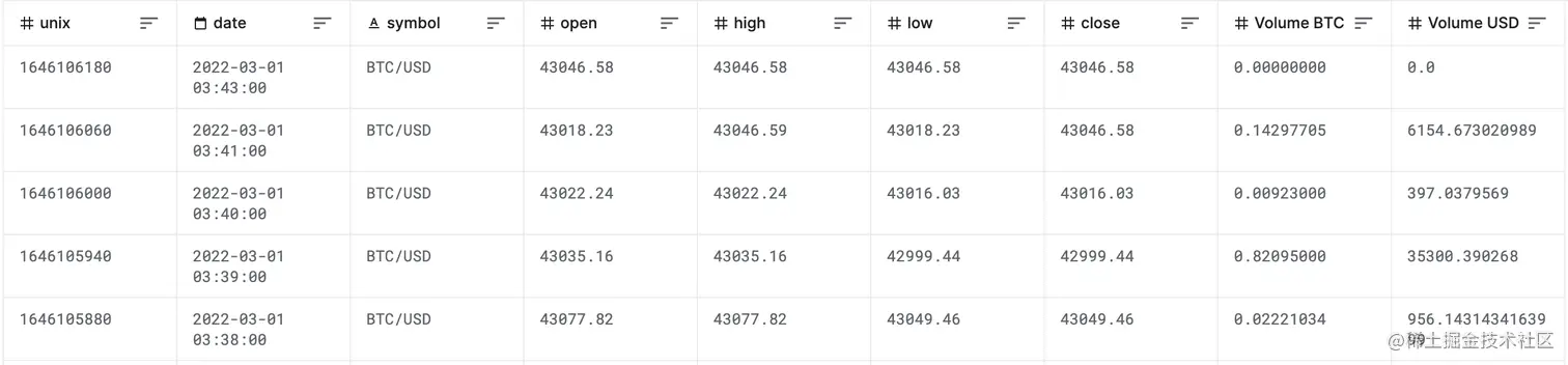 Bitcoin 的数据集部分示例如下: