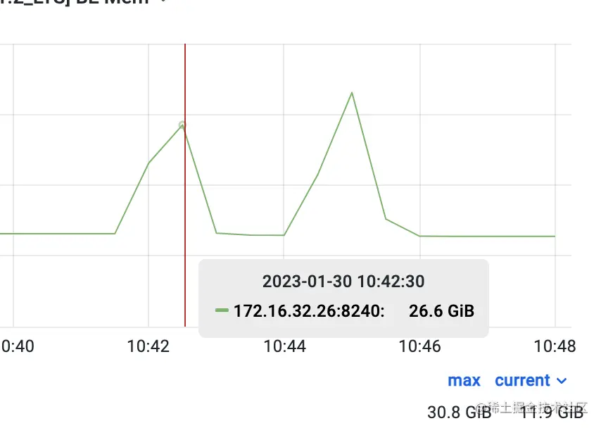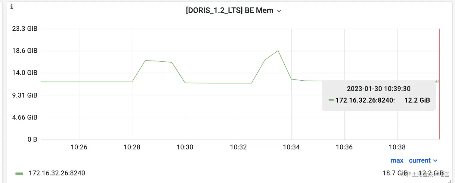 下图的 Grafana 监控中可以看到执行测试前的 Doris 内存稳定为 12.2GB