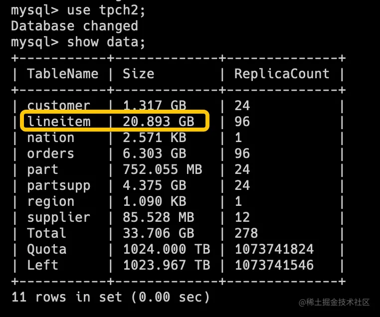 tpch2 库(老版本 Decimal)的 Lineitem 表的存储占用为 20.893GB