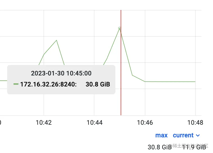 内存回落正常后,在 tpch2 库(老版本 Decimal)下执行,内存占用峰值为 30.8GB