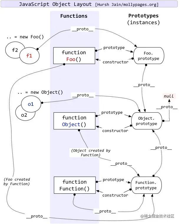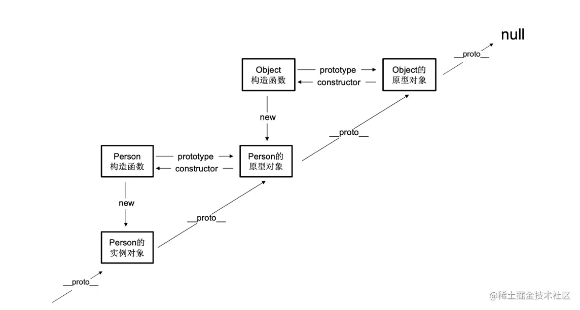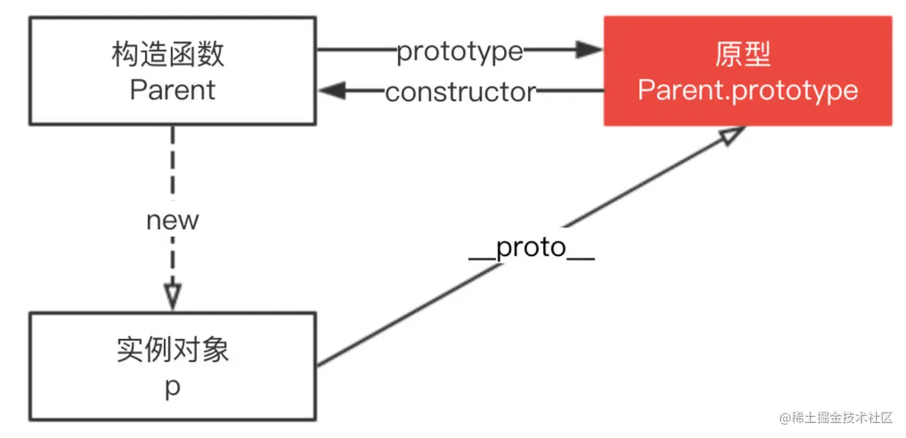 我们来看图说话:构造函数.prototype = 原型对象;原型对象.constructor = 构造函数;New 构造函数 = 实例对象;实例对象.__proto__ = 原型 。