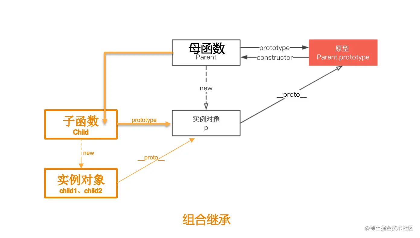 缺点:在使用子函数的实例对象时,其原型中会存在两份相同的属性/方法。(两份属性/方法的原因是:原型链继承的时候 new Parent 的过程里会有Parent.apply操作,盗用构造函数的时候也有Parent.apply操作,导致母函数里的属性和方法被同时放在子函数内和图中实例对象p上。)