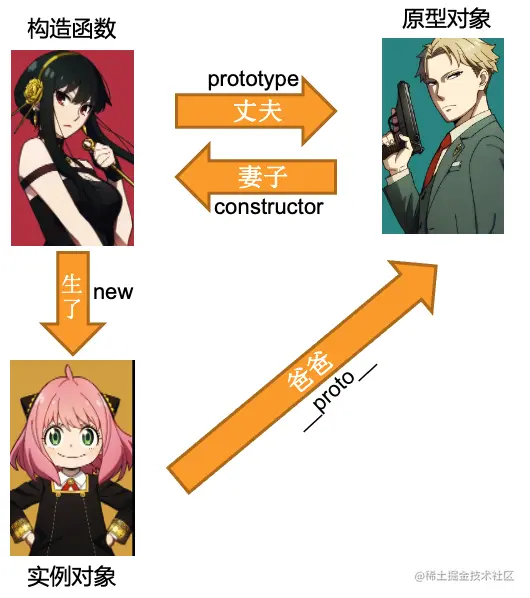 用动画片《间谍过家家》来表述就是:构造函数就是母亲“约尔太太”,原型对象是家里的男主人“黄昏”,实例对象就是“阿尼亚”。约尔太太称呼黄昏为丈夫(prototype),黄昏称呼约尔太太妻子(constructor),约尔太太生(new)了阿尼亚,阿尼亚的爸爸(__proto__)是黄昏。