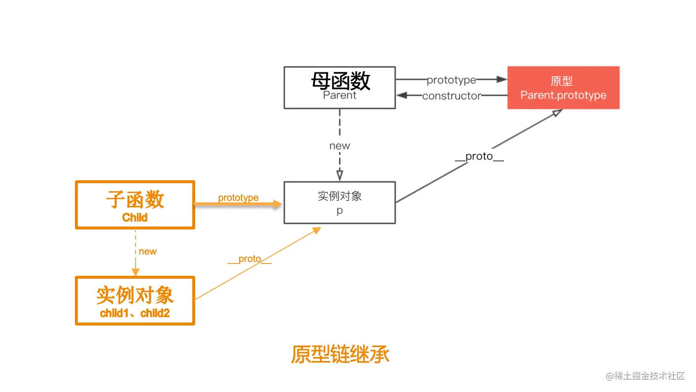 概念:让子函数.prototype等于母函数的实例对象,进而使子函数的实例对象通过__proto__不断向上找寻相关属性,直到找到为止。