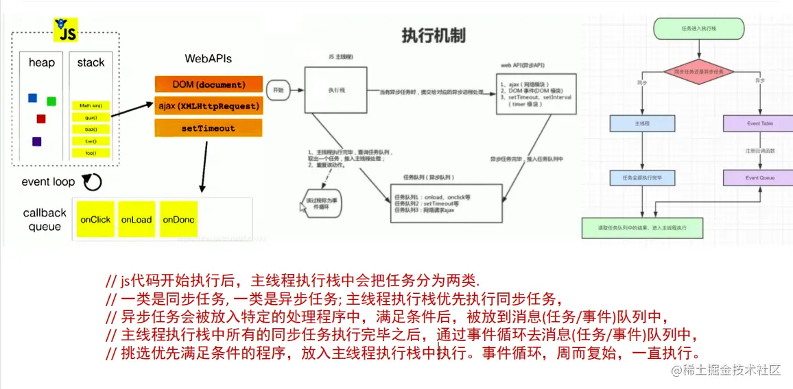 EventLoop事件循环的是在浏览器中的一个概念.浏览器中的EventLoop:js是单线程的,一次只能做一件事。js在浏览器这个宿主环境中运行。用户交互,定时器,网络请求等等浏览器中的事件会产生对应的任务,任务多了要在任务队列中排队,浏览器的主线程依次取出
