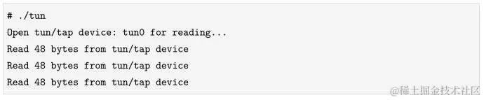 做好上面一系列配置后,tun0网卡上已经收到3个48字节的报文: