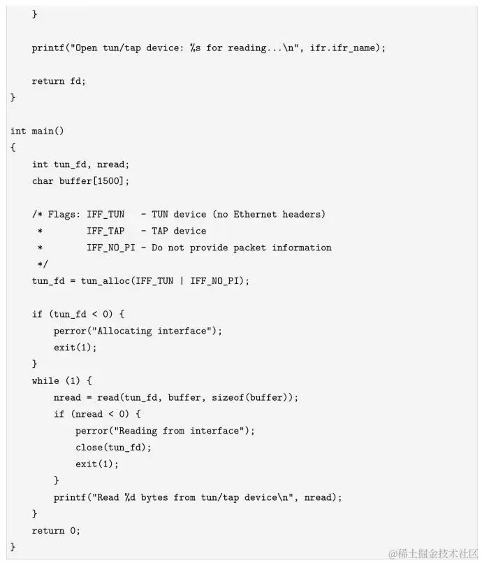 我们将用一个简单的C语言程序示范tun设备的具体使用方法。程序代码如下所示: