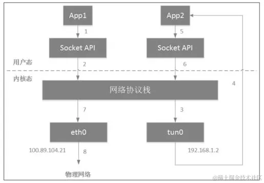 (1)App1通过Socket API发送了一个数据包,假设这个数据包的目的IP地址是192.168.1.3(和tun0在同一个网段)。