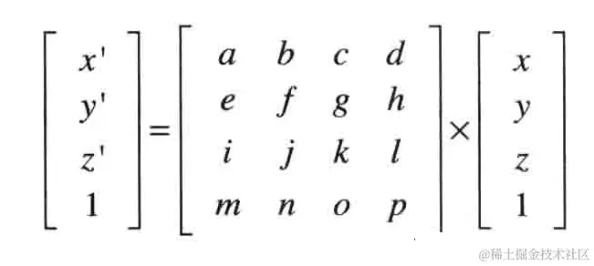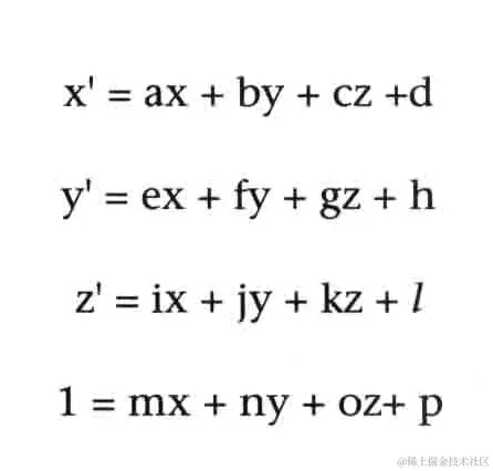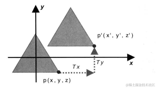 为了解决这个问题,结合之前齐次坐标系的知识,可以使用一个4维的矩阵,同时将点坐标也扩充为vec4,设原始点坐标为(x,y,z,1),平移后点坐标为(x’,y’,z’,1):