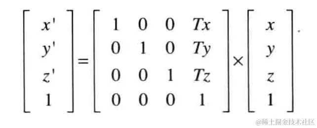 比较x’,可得a=1,b=0,c=0,d=Tx;比较y’,可得f=1,e=0,g=0,h=Ty;比较z’,可得k=1,i=0,j=0,l=Tz;由此可得平移矩阵的表达式: