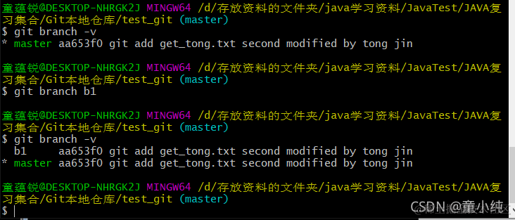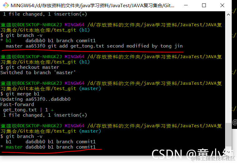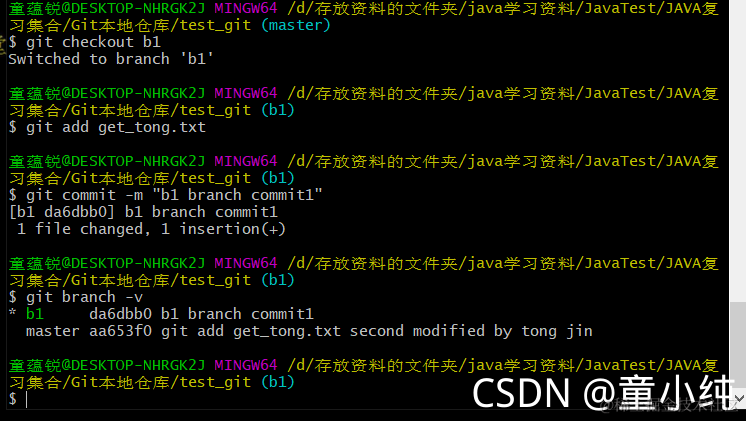 Git运用 三 (Gitee版) 童小纯 2023-01-31 50 阅读1分钟 创建分支:git branch [分支名称] git branch b1 查看分支: git branch -v 切换分支:git checkout b1 给分支添加内容:git add get_tong.txt git commit -m "b1 branch commit1" git branch -v 先要切换到接收合并的分支 删除分支:git branch -d b1