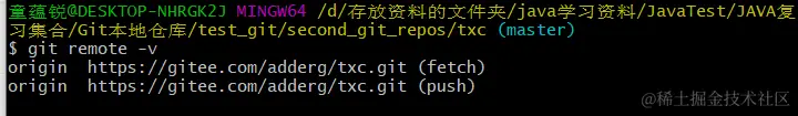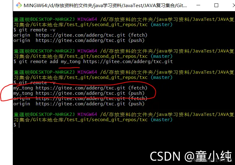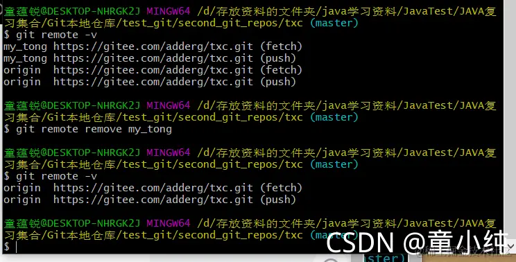 Git运用------仓库地址管理(Gitee版) 童小纯 2023-01-31 38 阅读1分钟 进行远程操控仓库都有哪些: $ git remote -v 添加远程仓库别名:git remote add my_tong gitee.com/adderg/txc.… 删除远程仓库别名: git remote remove my_tong