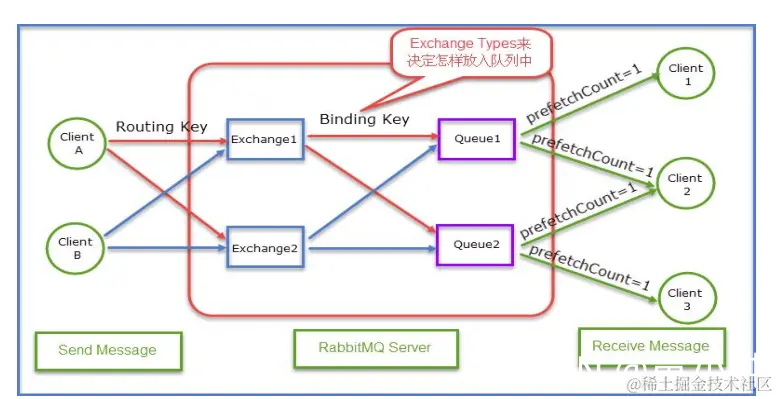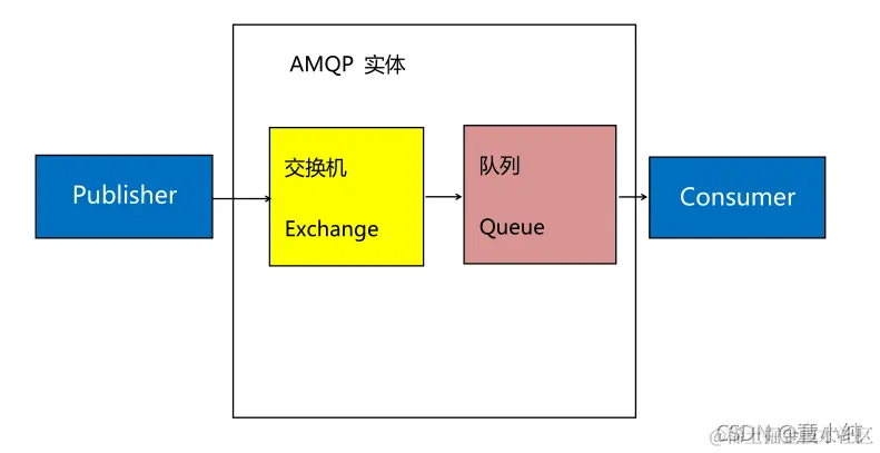 发布者(Publisher)发布消息(Message),经过交换机(Exchange),交换机根据路由规则将收到消息分发给交换机绑定的队列(Queue),最后 AMQP 代理会将消息投递给订阅了此