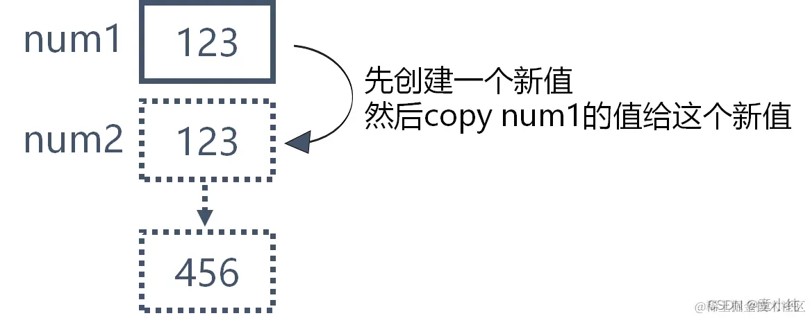 num1向num2 复制基本类型的值的时候,会在第二行创建一个新值(即num2),然后把该值复制到num2上。
