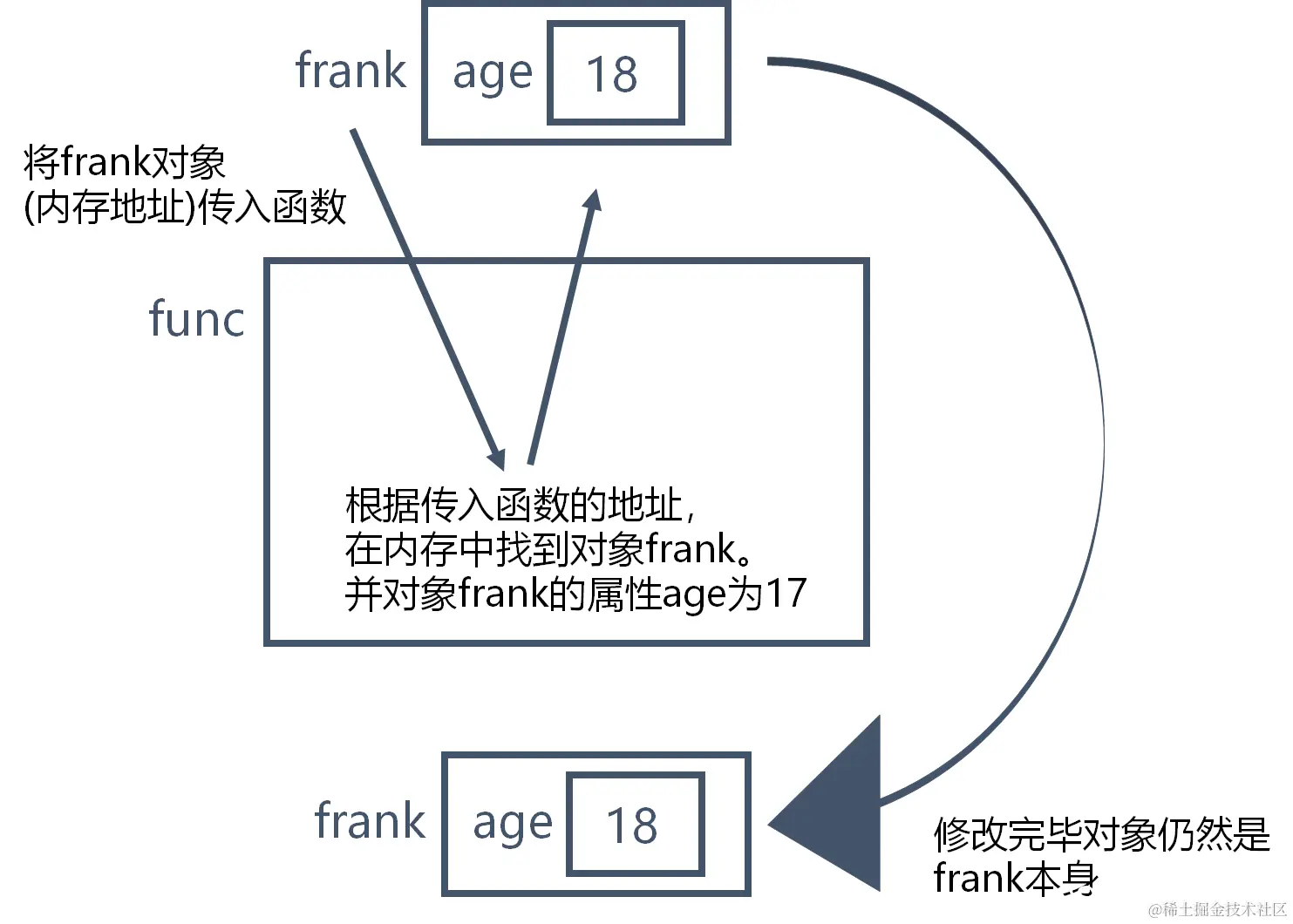 var frank = { age : 18 }; 传入函数的实际上是frank对象的内存地址。