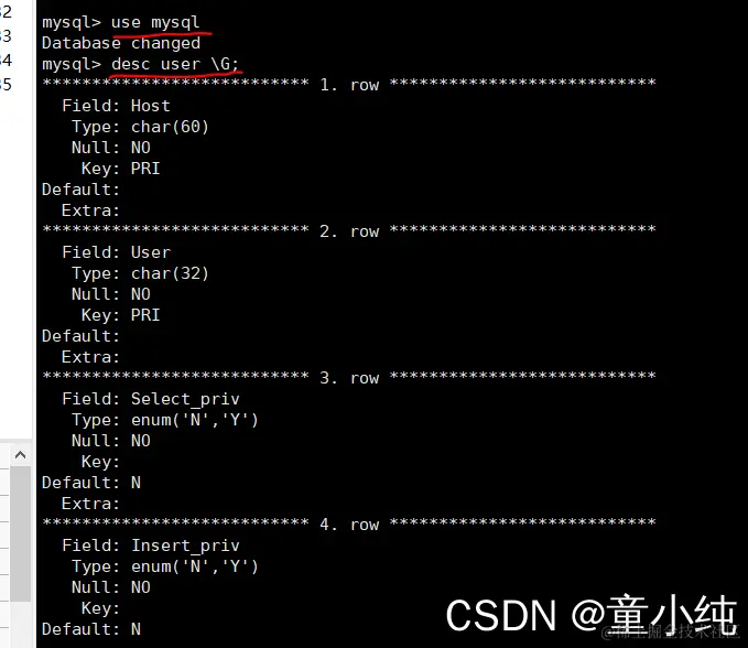 #查看表user结构,加\G 则列显示,每个字符属性都会一个一个显示,方便看