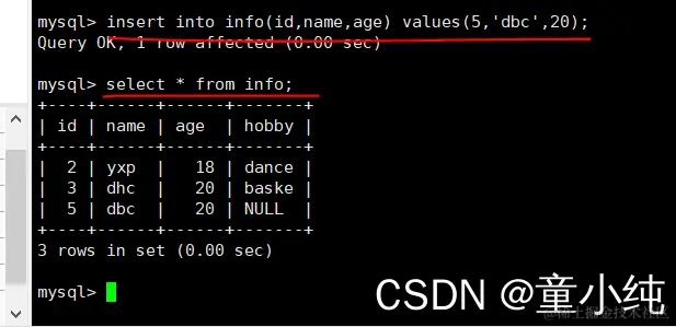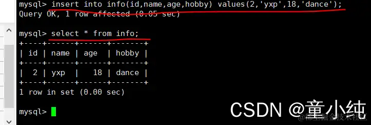 insert into info(id,name,age,hobby) values(2,'yxp',18,'dance')